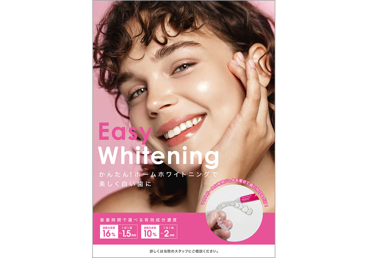 ・当院ではホームホワイトニング(ご自宅でマウスピースと薬剤を使う方法)を導入しています。歯の表面を傷つけずに自然で持続的な白さが得られます。